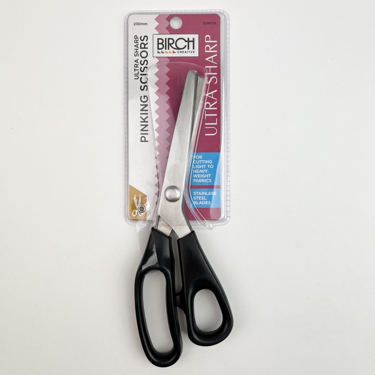 Ultra Sharp Pinking Scissors - 230mm. These sharp, quality scissors with stainless steel blades are designed to stay sharp. Pinking shears are a variety of scissor which feature a saw-toothed blade. They leave a zigzag pattern instead of a straight edge, and are often used for finishing cut edges of woven fabric. The zig-zag angle of the blade cuts fabric on the bias, and will prevent some fraying from occurring.