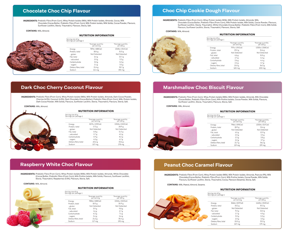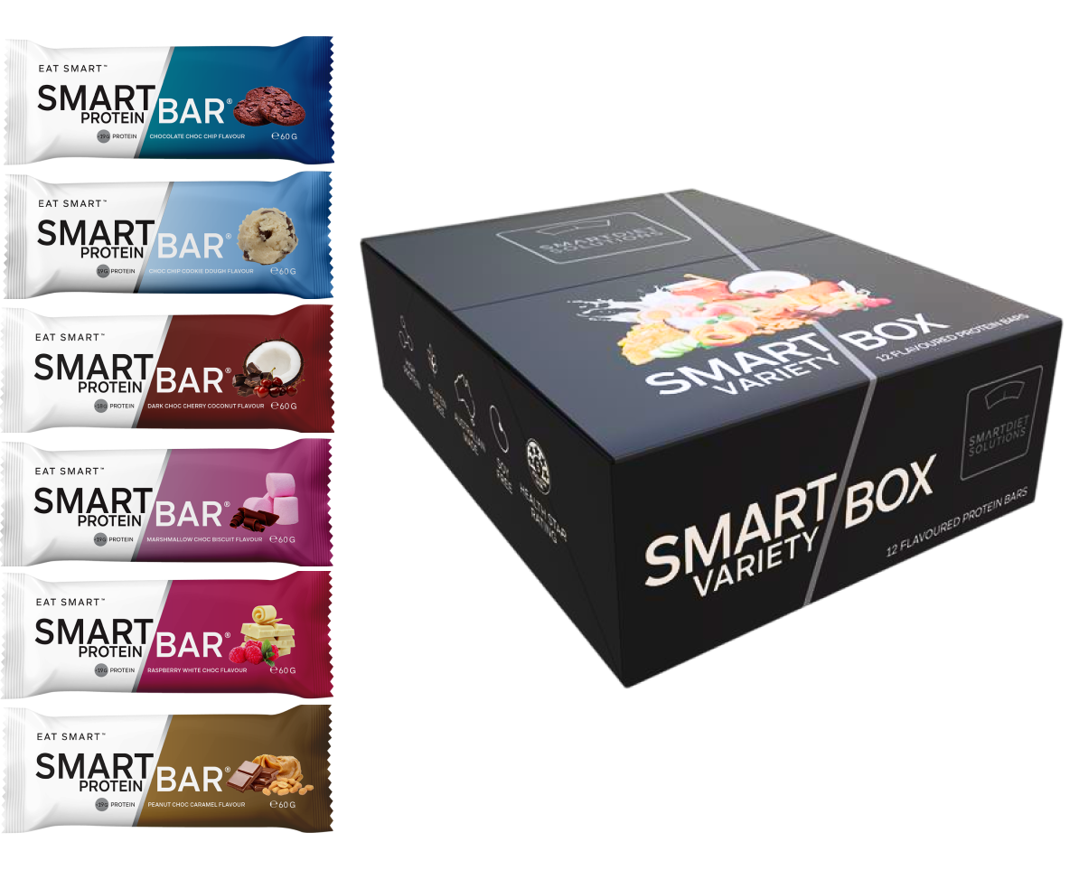 The box contains 12 bars, featuring 2 of each of our most popular chocolate flavours: Chocolate Choc Chip, Dark Choc Cherry Coconut, Peanut Choc Caramel, Choc Chip Cookie Dough, Marshmallow Choc Biscuit, and Raspberry White Chocolate.