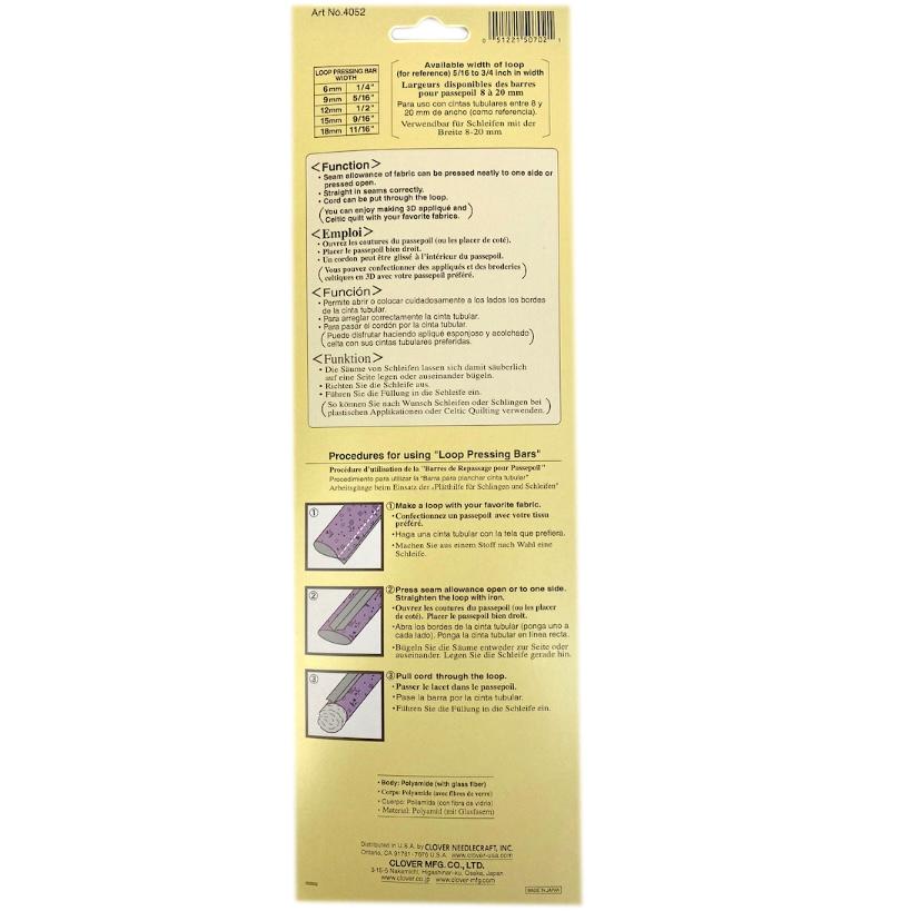 This handy tool by Clover allows for easy creation of loops with an iron. The seam allowance of your loops can be pressed to the side, seams easily straightened and cords pulled through smoothly. There are five different widths 18mm, 15mm, 12mm, 9mm and 6mm.