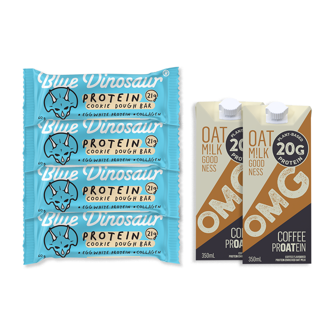 Get 4 boxes of 12 of Cookie Dough Peanut Butter Protein Bar plus 2x 350ml OMG Coffee PrOATein Oat Milks. That's a total of 48 protein bars PLUS 2x OMG Oat Milks!