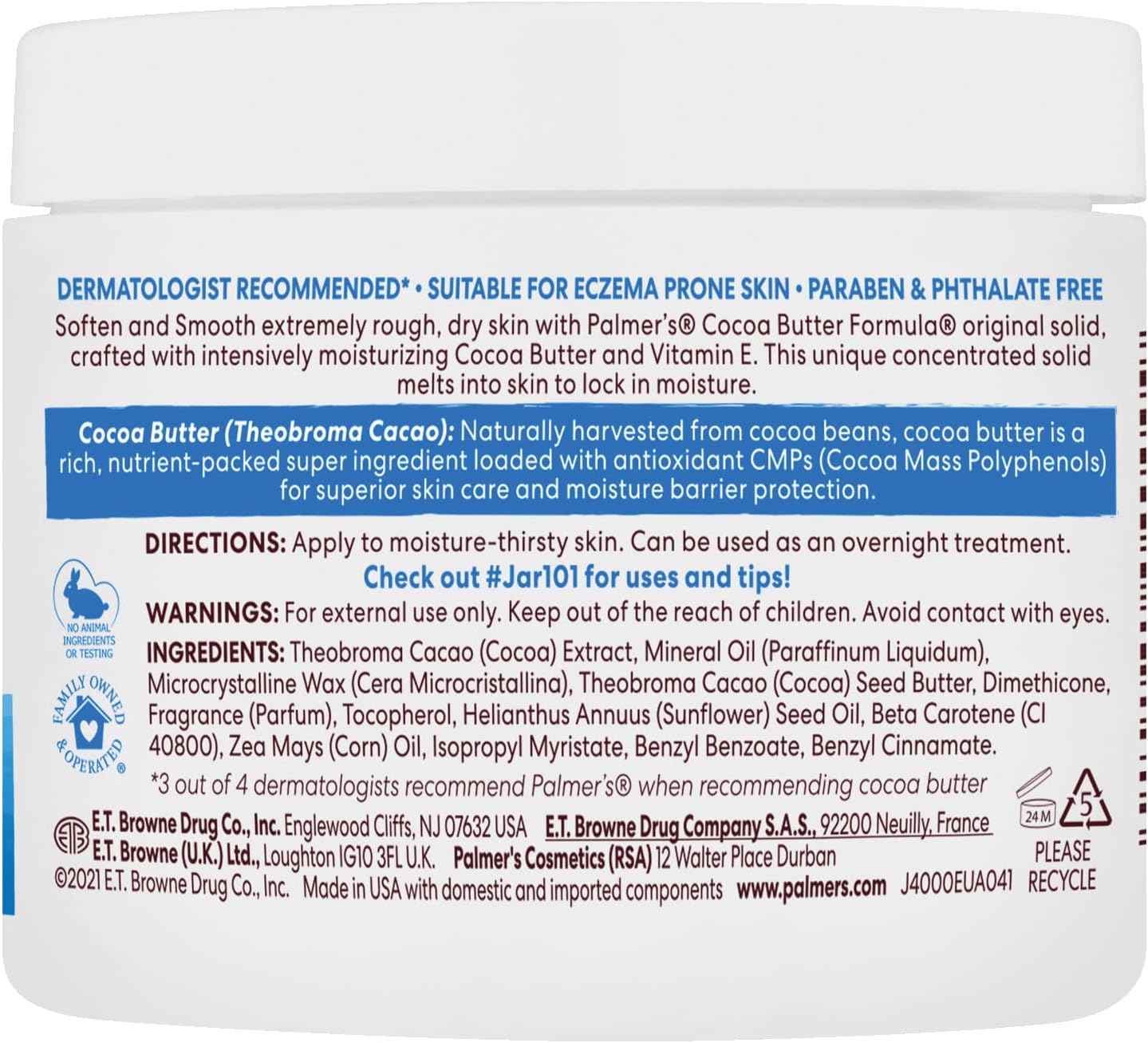 Palmer's cocoa butter formula skin cream with vitamin E is an advanced moisturizer that helps heal, soften, and protect rough, dry skin--it's like youth in a jar. Palmer's unique formula is enriched with natural cocoa butter and vitamin E to penetrate dryness, restore vital moisture, and smooth unattractive marks. It's perfect for head-to-toe use after a bath or shower, exposure to wind and cold, or as an after-tanning moisturizer.