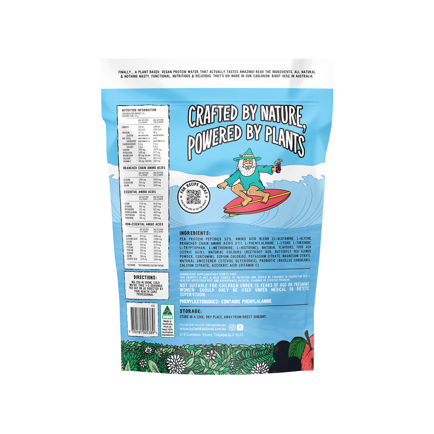 Pea Protein Peptides 52%, Amino Acid Blend (L-Glutamine, L-Glycine, Branched Chain Amino Acids 2:1:1, L-Phenylalanine, L-Lysine, L-Threonine, L-Tryptophan, L-Methionine, L-Histidine), Natural Flavours, Food Acid (Citric Acid), Natural Colours (Beetroot Red, Butterfly Pea Flower Powder, Curcumin), Sodium Chloride, Potassium Citrate, Magnesium Citrate, Natural Sweetener (Steviol glycosides), Probiotic (Bacillus coagulans), Calcium Citrate, Ascorbic Acid (Vitamin C).Β Β