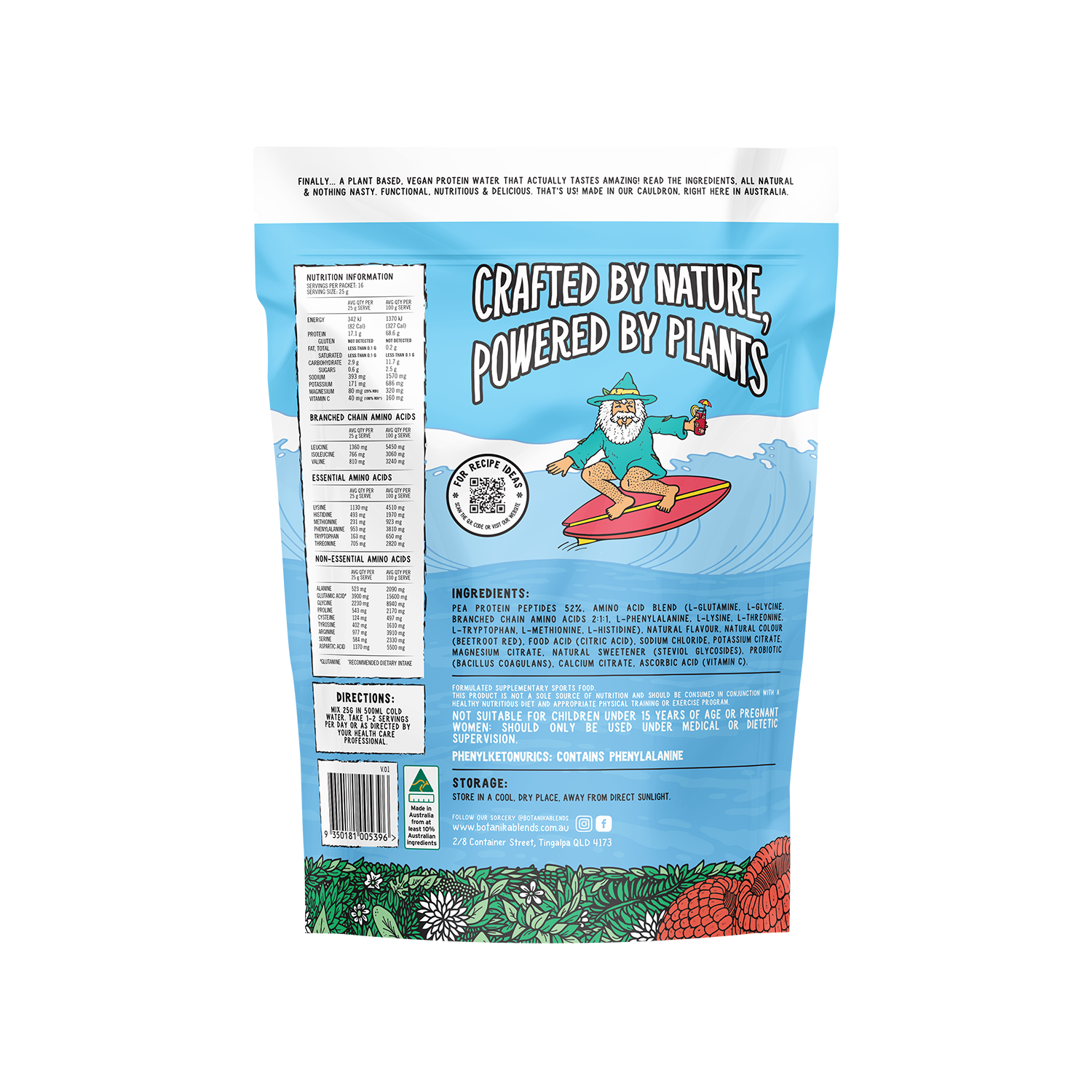 Pea Protein Peptides 52%, Amino Acid Blend (L-Glutamine, L-Glycine, Branched Chain Amino Acids 2:1:1, L-Phenylalanine, L-Lysine, L-Threonine, L-Tryptophan, L-Methionine, L-Histidine), Natural Flavours, Food Acid (Citric Acid), Natural Colours (Beetroot Red, Butterfly Pea Flower Powder, Curcumin), Sodium Chloride, Potassium Citrate, Magnesium Citrate, Natural Sweetener (Steviol glycosides), Probiotic (Bacillus coagulans), Calcium Citrate, Ascorbic Acid (Vitamin C).ย ย