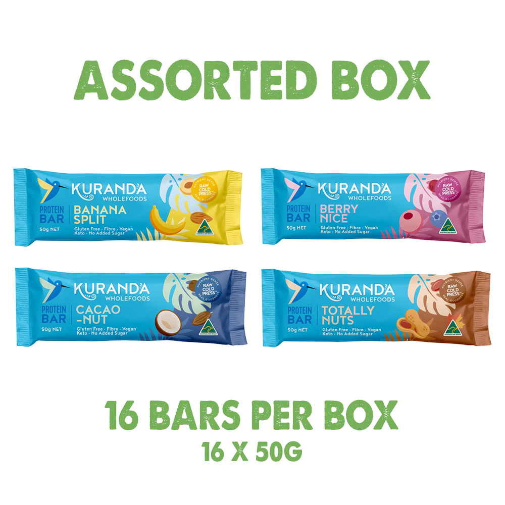 Our Kuranda Wholefood's protein bars are all-natural, use a Cold Pressed Process, whereby all the wholefoods fantastic nutrients are retained in the product. This sets Kuranda Wholefood's products aside from others who bake or extrude their product, burning off nutrients.