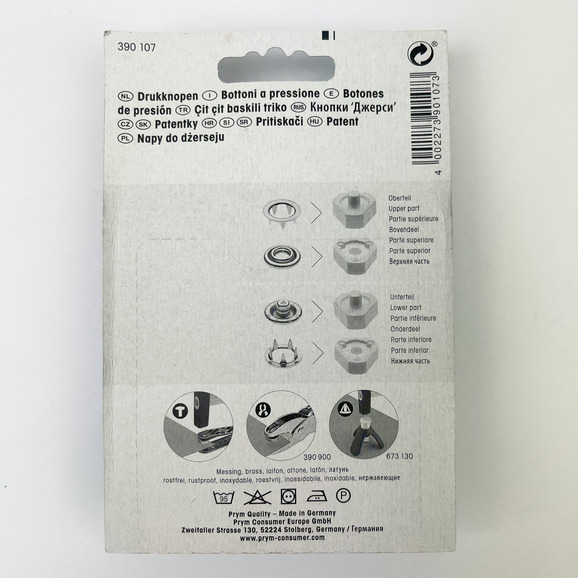 The Prym "Jersey" Press Fasteners feature medium strength fastening designed for thinner and stretchier fabrics. The serrated ring presses down the fabric, meaning no hole is required to be punctured.