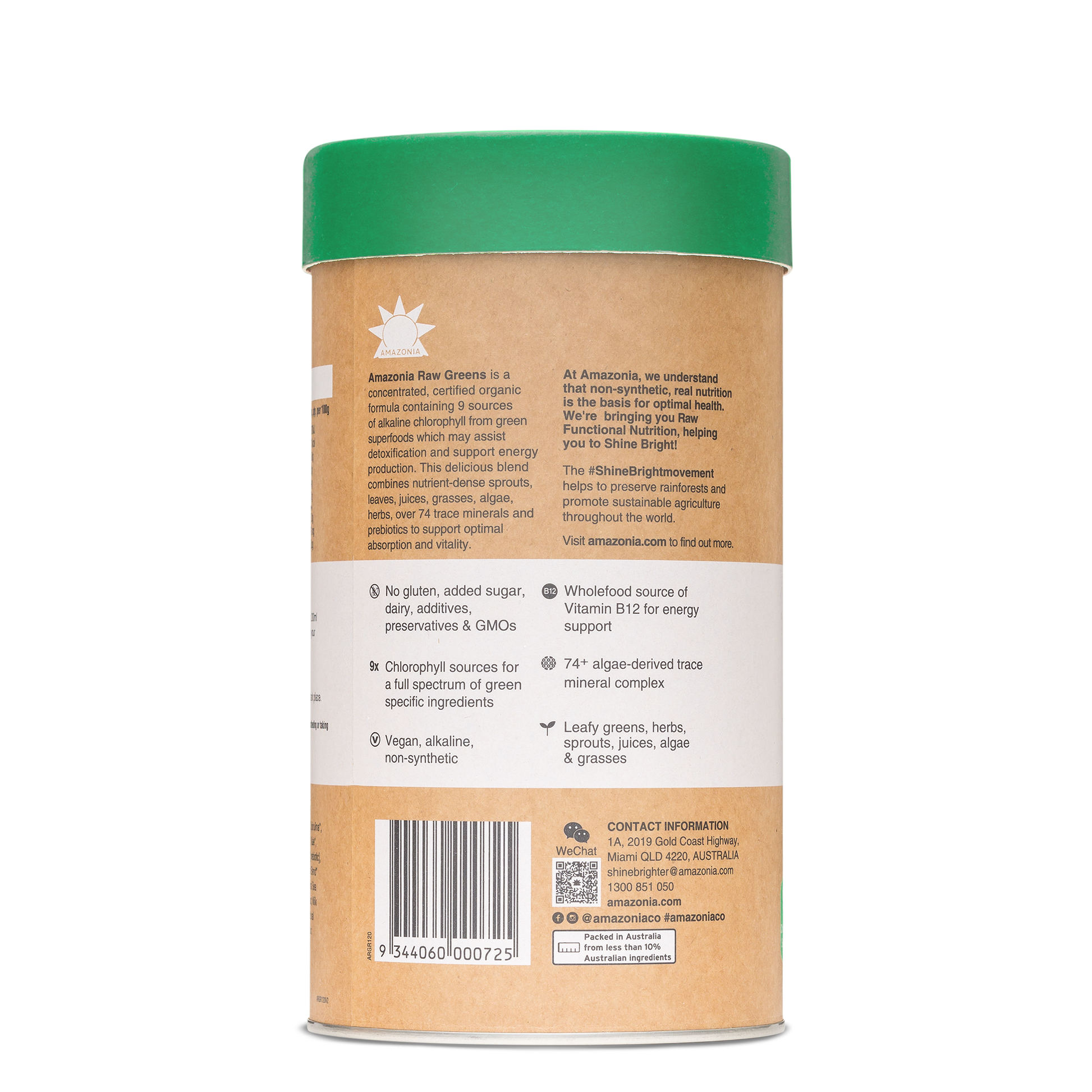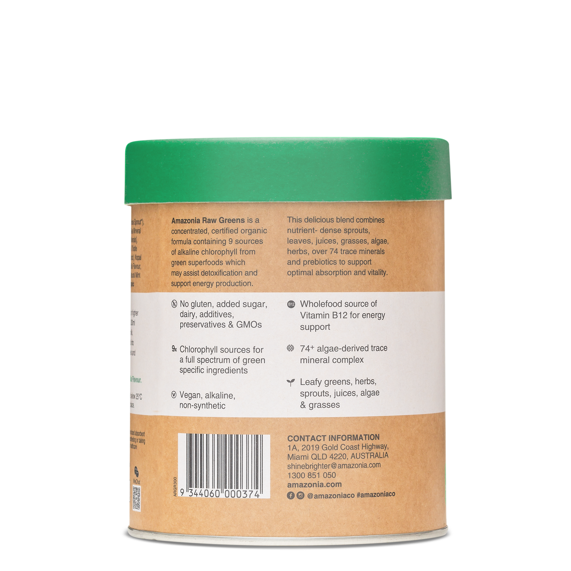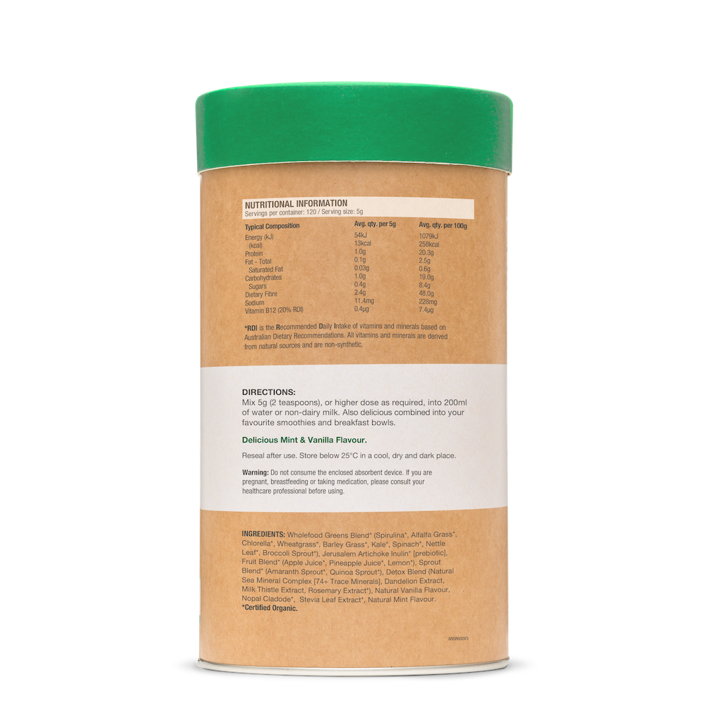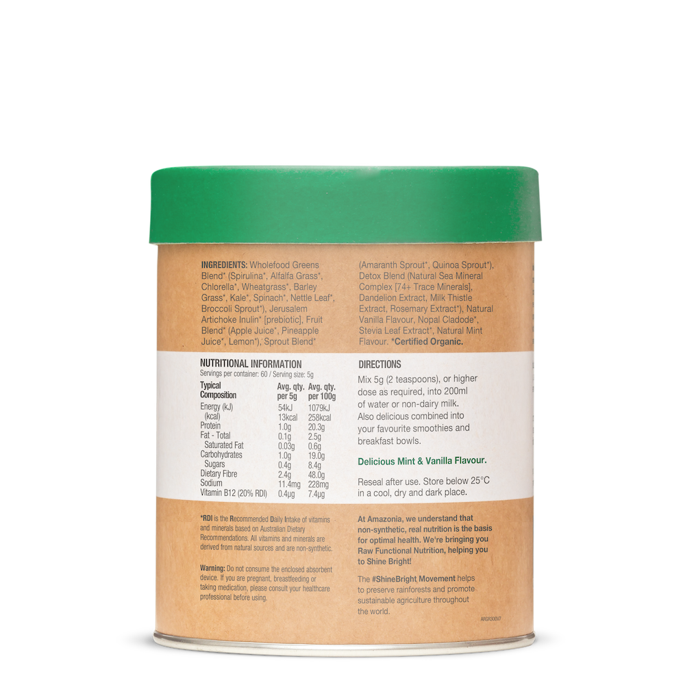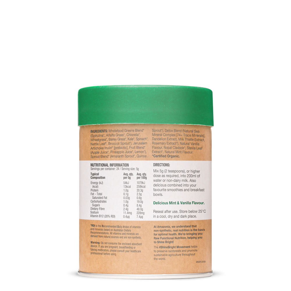 A powerhouse greens blend containing 9 sources of alkaline chlorophyll, wholefood Vitamin B12, gut-friendly prebiotics and more than 74 trace minerals to detoxify and support optimal liver function.