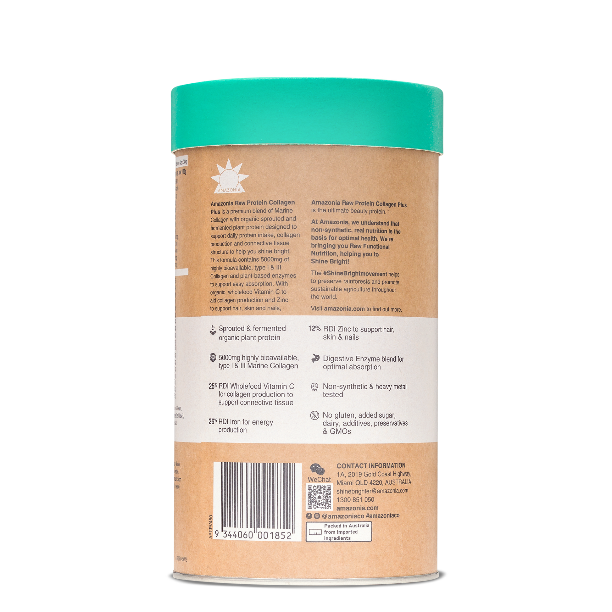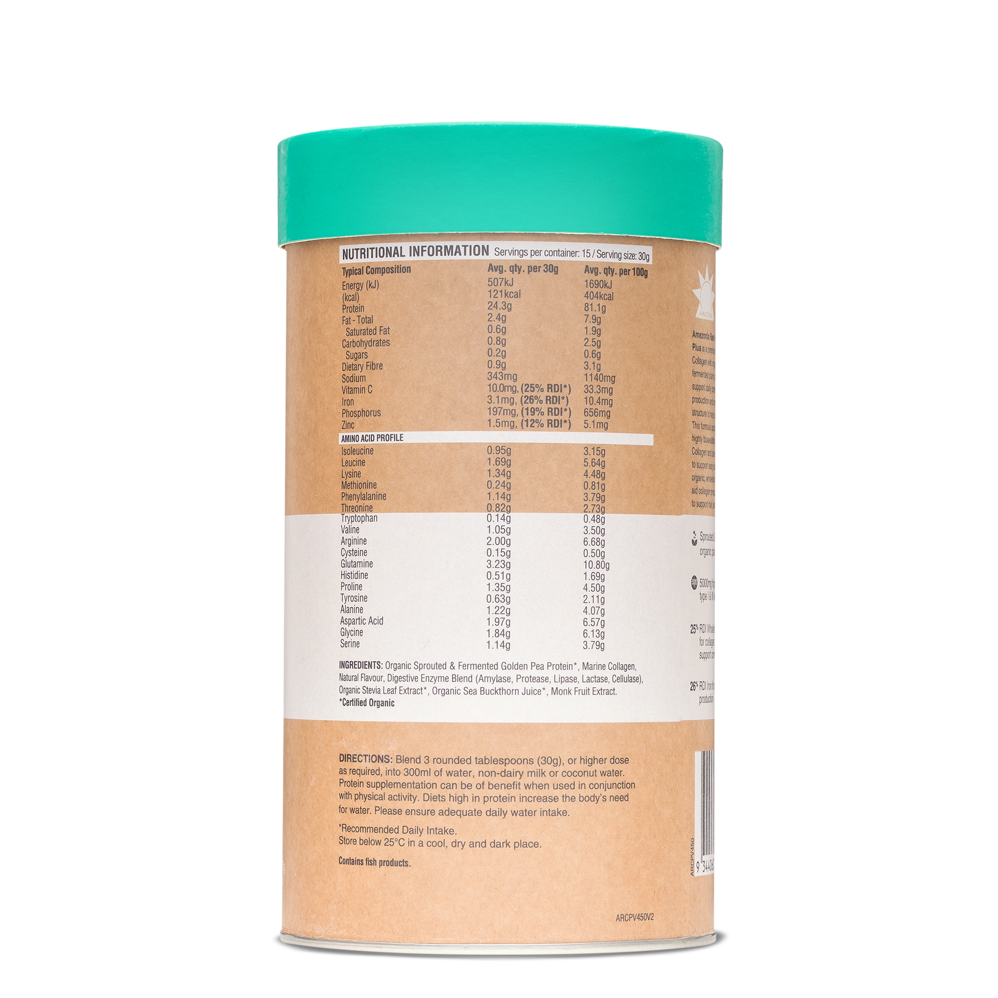 Each serve contains 5000mg of highly bioavailable Type I & III Hydrolysed Marine Collagen Peptides and up to 24g of organic sprouted and fermented plant protein.