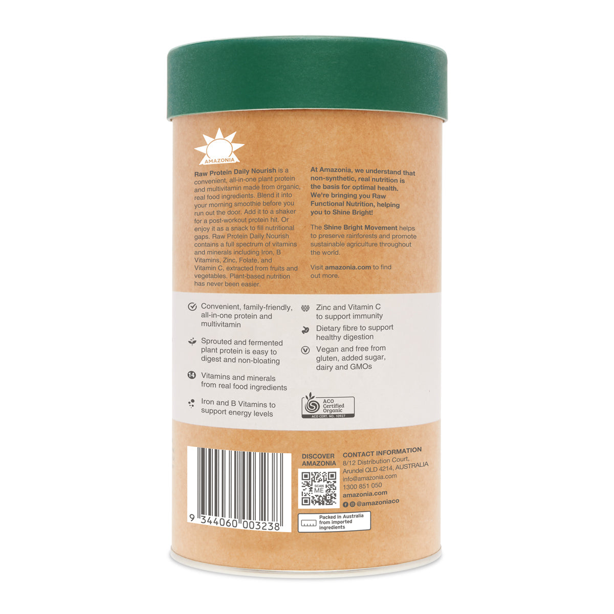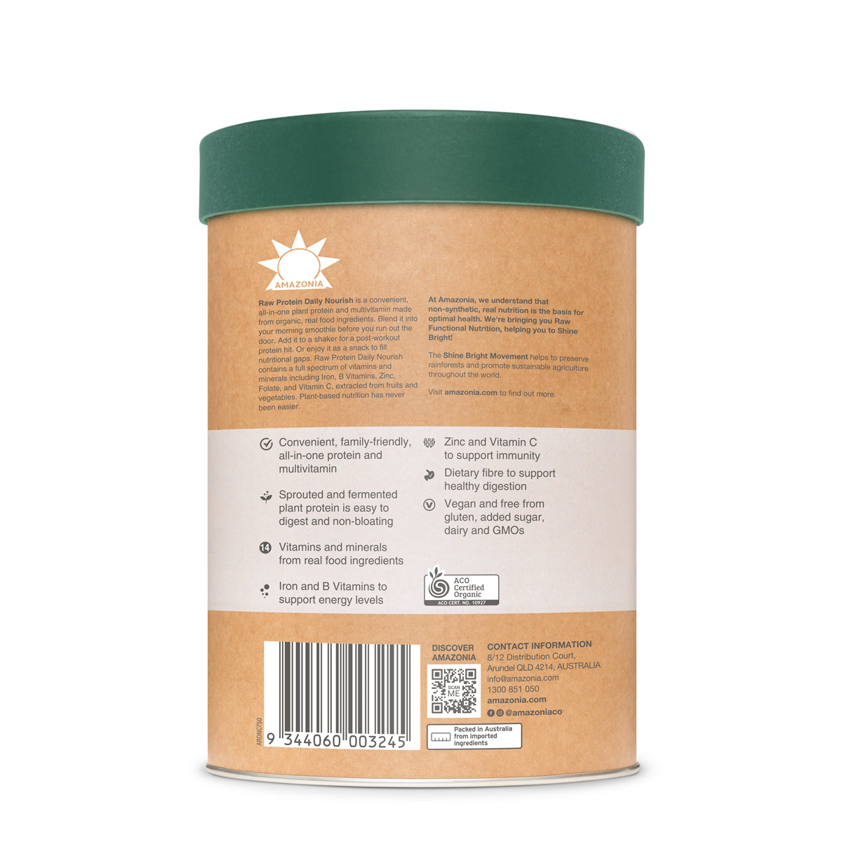 Raw Protein Daily Nourish contains a full spectrum of vitamins and minerals including Iron, B Vitamins, Zinc, Folate, and Vitamin C, extracted from fruits and vegetables.