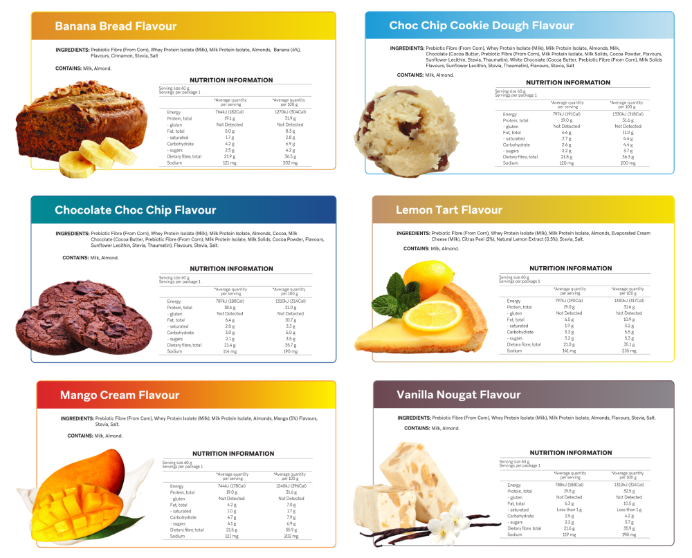 The box contains 12 bars, featuring 2 of each of our most popular flavors: Chocolate Choc Chip, Vanilla Nougat, Banana Bread, Choc Chip Cookie Dough, Mango Cream, and Lemon Tart.